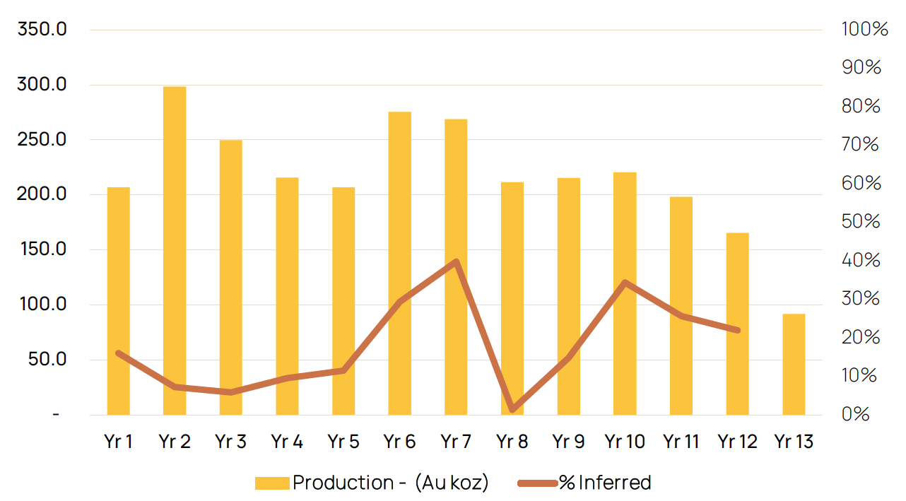 Consistent with PEA studies, the production profile includes Inferred resources and is provided in the chart below. Approximately 16% of the ounces mined in the PEA profile are in the Inferred category, which cannot be included in the Feasibility Study scheduled for Q4/26. In order to upgrade a portion of these Inferred ounces to the Indicated category, the Company will commence an infill drilling program in Q1/26. The mineralization at Coffee is such that it hosts a number of high grade near surface zones that enable the mining of good grade material early in the mine plan allowing for higher average production in the initial five years.