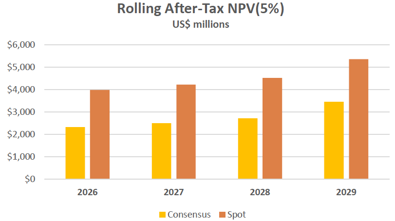 2 Analyst consensus prices as at February 18, 2026: US$4,100/oz in 2029 and US$3,620 in 2030 and beyond.