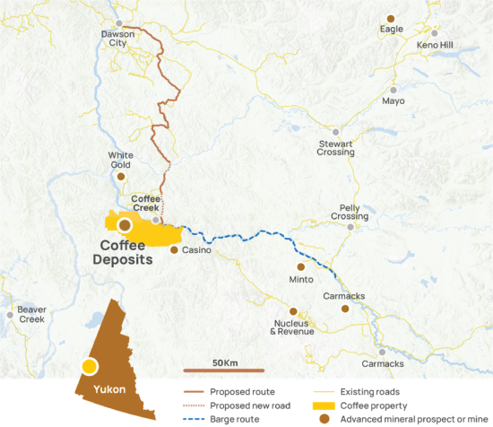 The Coffee Gold Project is located approximately 130 km south of Dawson in Canada’s Yukon Territory (Figure 1). The project is situated within the prolific Yukon- Tanana Terrane (YTT), and within the wider Tintina Gold Province, which hosts numerous multi-million-ounce deposits and producing mines including Kinross’ Fort Knox Mine and Snowline’s Valley deposit. The lack of glaciation in the Yukon has allowed for the preservation of extensive oxide ore deposits such as Coffee and the nearby Casino copper-gold deposit.