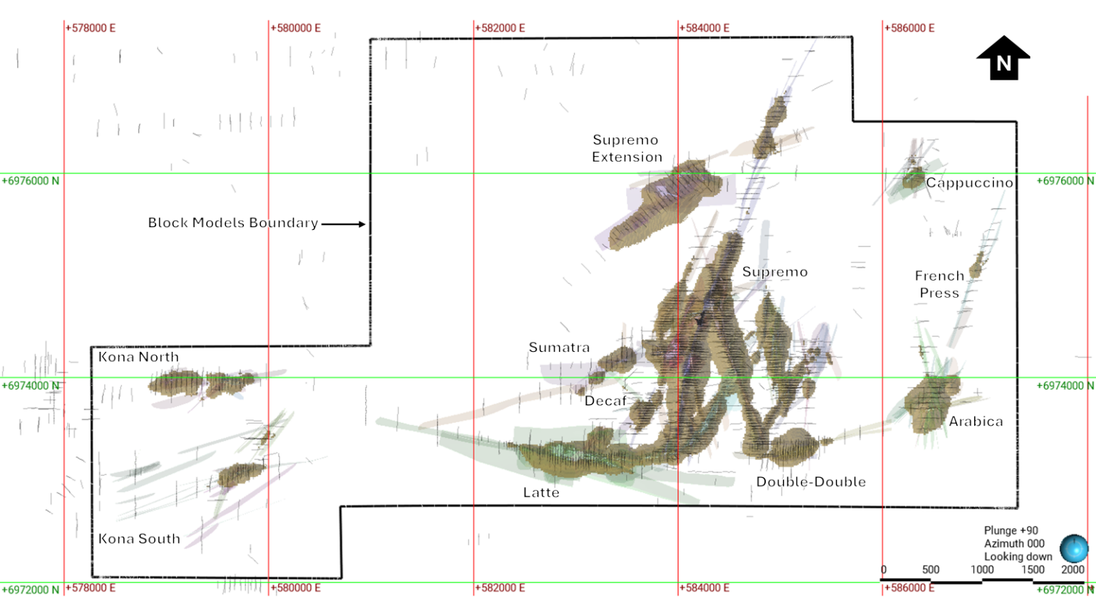 Figure 2 – The Coffee Deposit with principal resource zones, drilling and pit shells