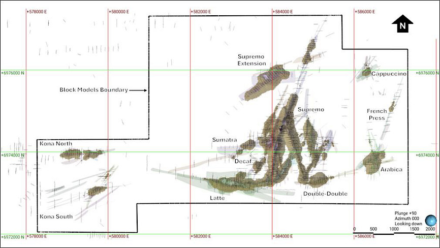 Exploration drilling has led to the discovery of gold mineralization in 15 separate areas (Figure 2): Supremo, Sumatra, Latte, Double-Double, Arabica, Americano West, Americano, Espresso, Kona, Kona North, Supremo Extension, Cappuccino, Dolce, French Press, and Sugar. Gold mineralization occurs in narrow to broad gold-bearing locally brecciated structures with quartz, albite, ankerite, dolomite, sericite, and pyrite alteration. The gold mineralization found to date is hydrothermal in origin and both structurally and lithologically controlled.