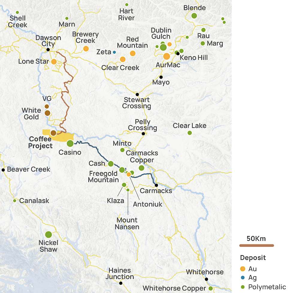 The Coffee Gold Project hosts 3.0 million ounces of open-pit heap-leach Measured and Indicated resource, as well as an Inferred Resource of 0.8 million ounces. The project is situated within the prolific Yukon- Tanana Terrane (YTT), and within the wider Tintina Gold Province, which hosts numerous multi-million-ounce deposits and producing mines including Kinross’ Fort Knox Mine and Snowline’s Valley deposit. The lack of glaciation in the Yukon Territory has allowed for the preservation of extensive oxide ore deposits such as Coffee and the nearby Casino copper-gold deposit.