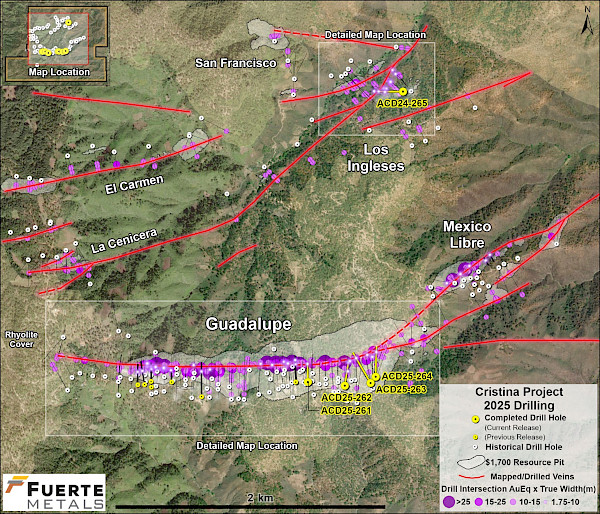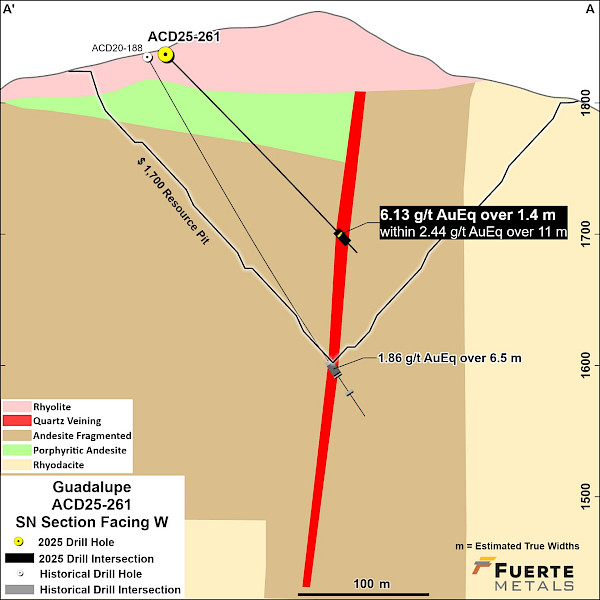 - 6.1 g/t AuEq over 1.4 m estimated true width (ETW) (4.8 g/t Au, 60 g/t Ag, 0.68% Zn, 0.18% Pb and 0.04% Cu) in hole ACD-25-261 in the Guadalupe vein system