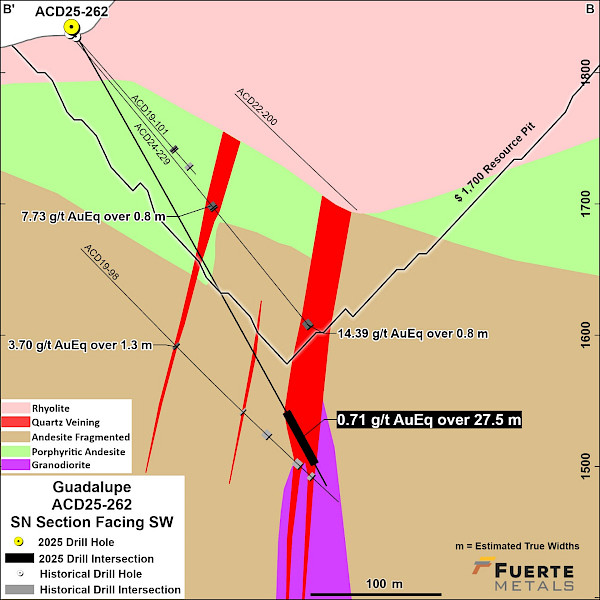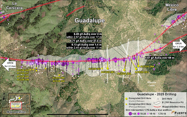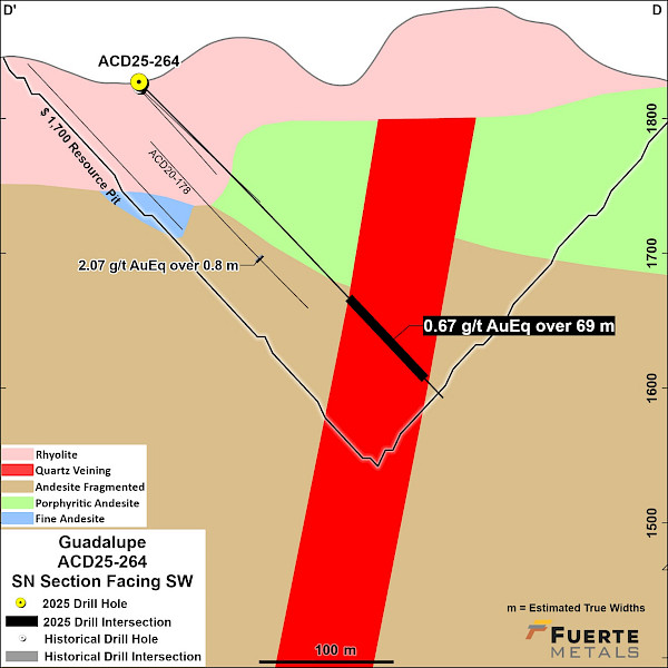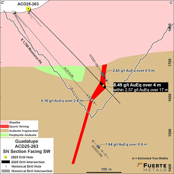 - 8.5 g/t AuEq over 4.0 m estimated true width (ETW) (0.9 g/t Au, 504 g/t Ag, 0.63% Zn, 0.1% Pb and 0.02% Cu) in hole ACD-25-263 in the Guadalupe vein system