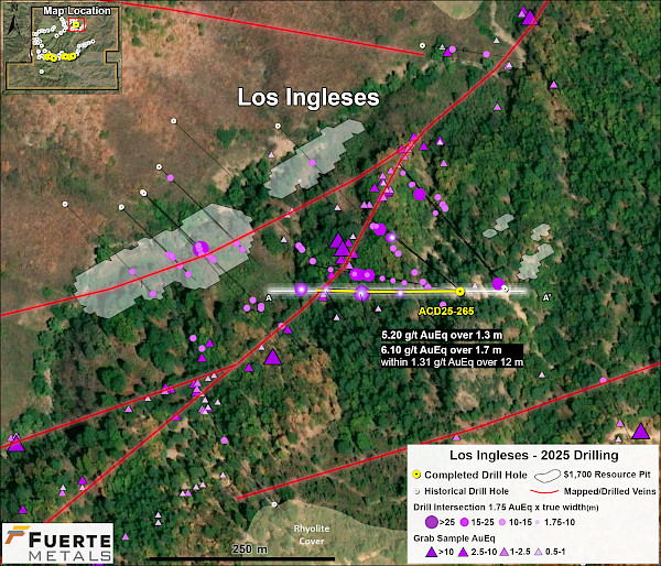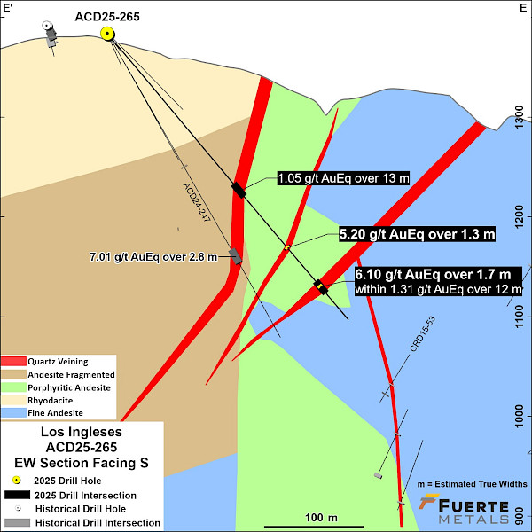 - 6.1 g/t AuEq over 1.7 m estimated true width (ETW) (0.8 g/t Au, 64 g/t Ag, 7.94% Zn, 2.21% Pb and 0.13% Cu) in hole ACD-25-265 in the Los Ingleses vein system